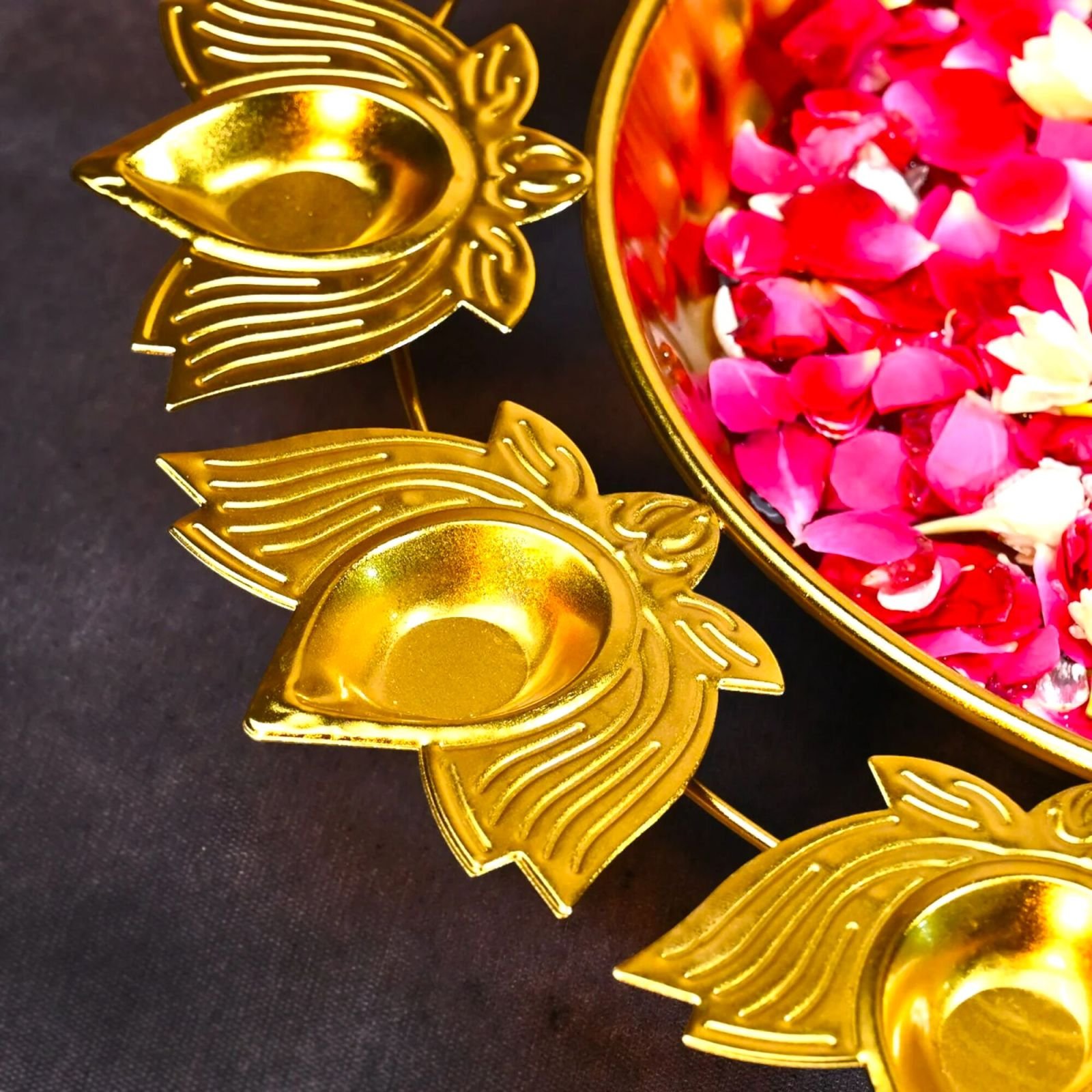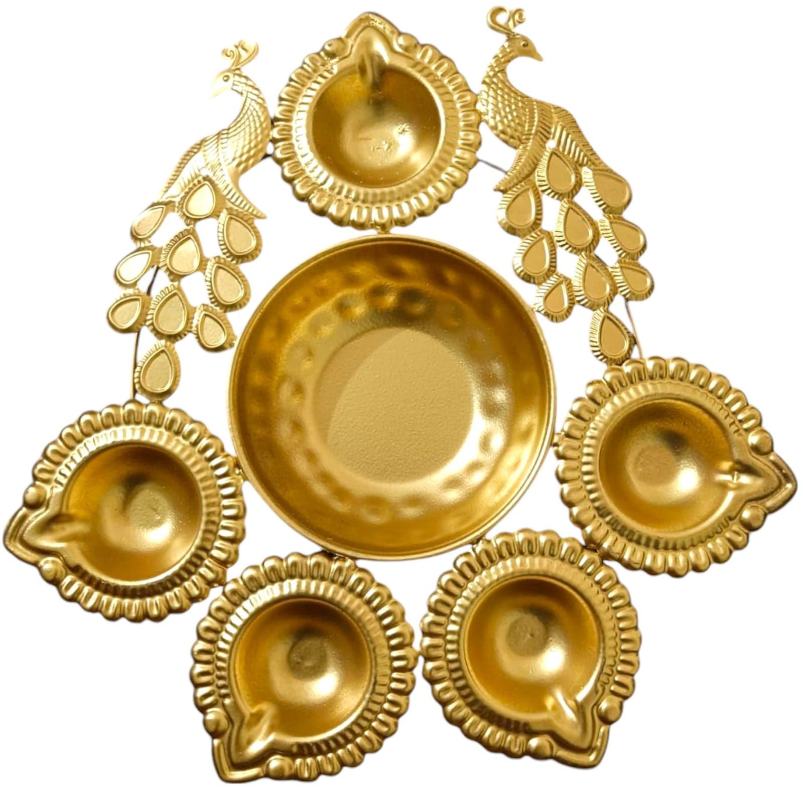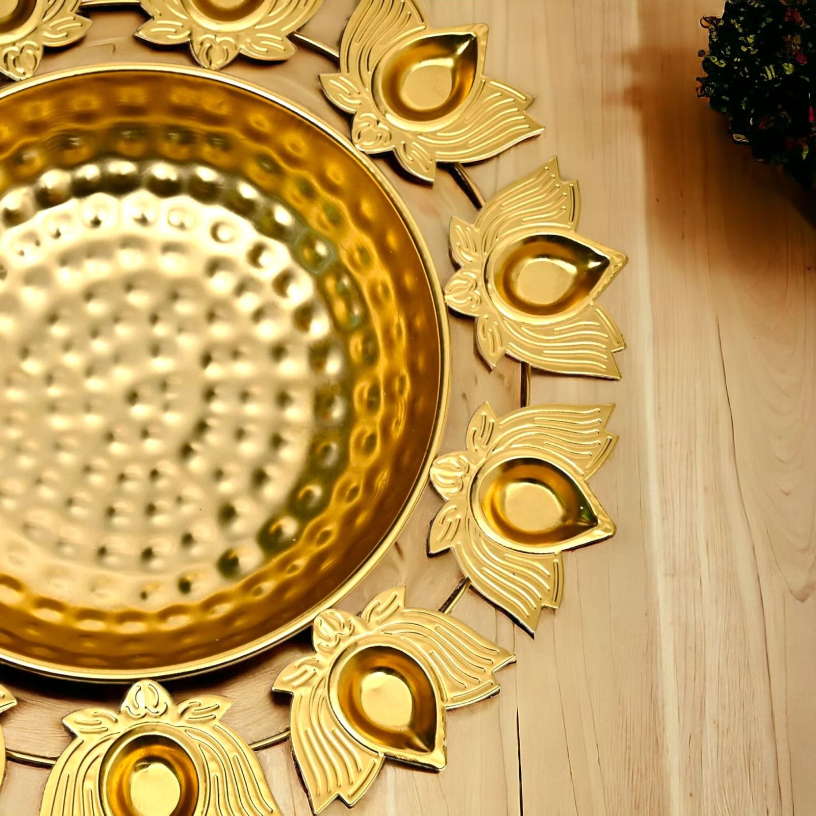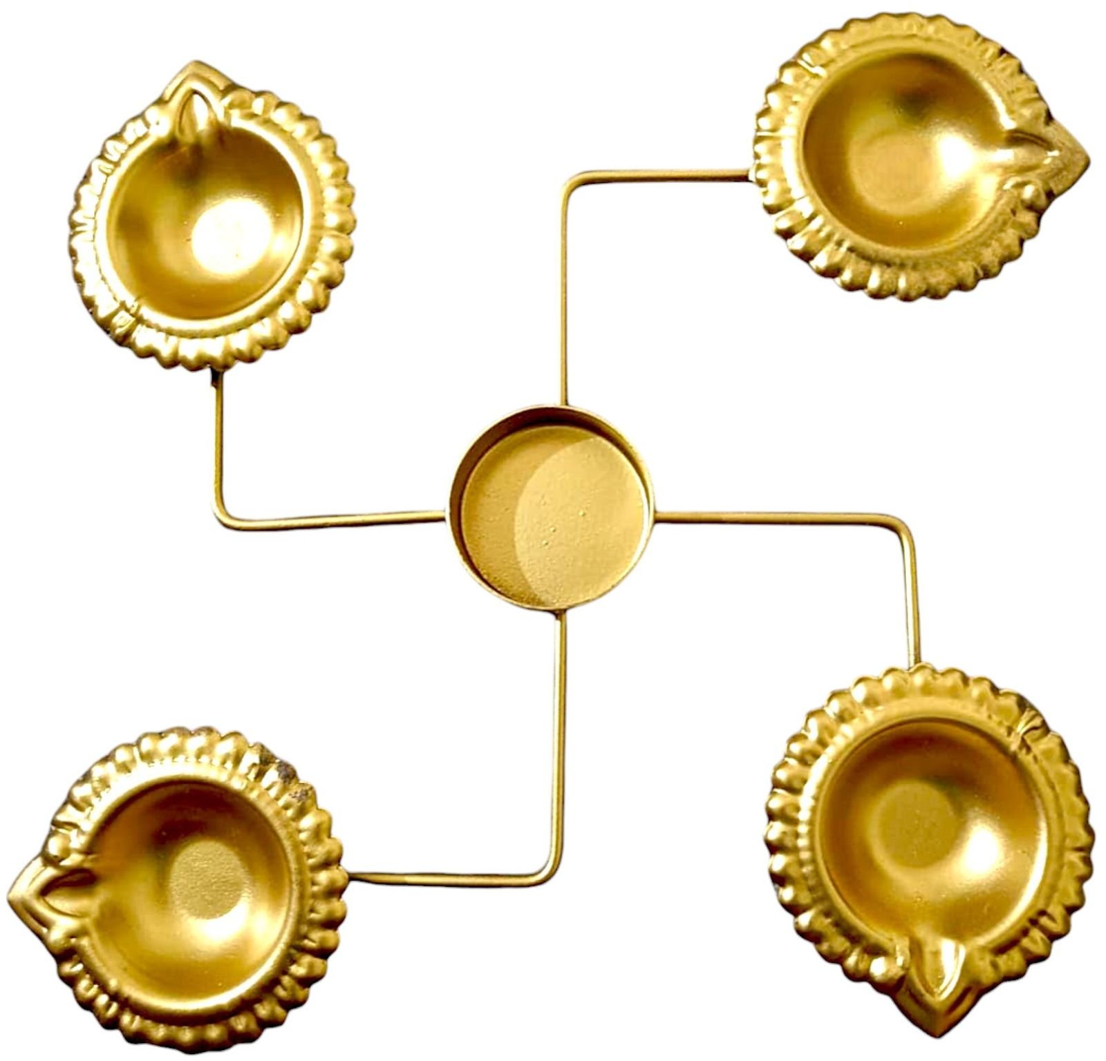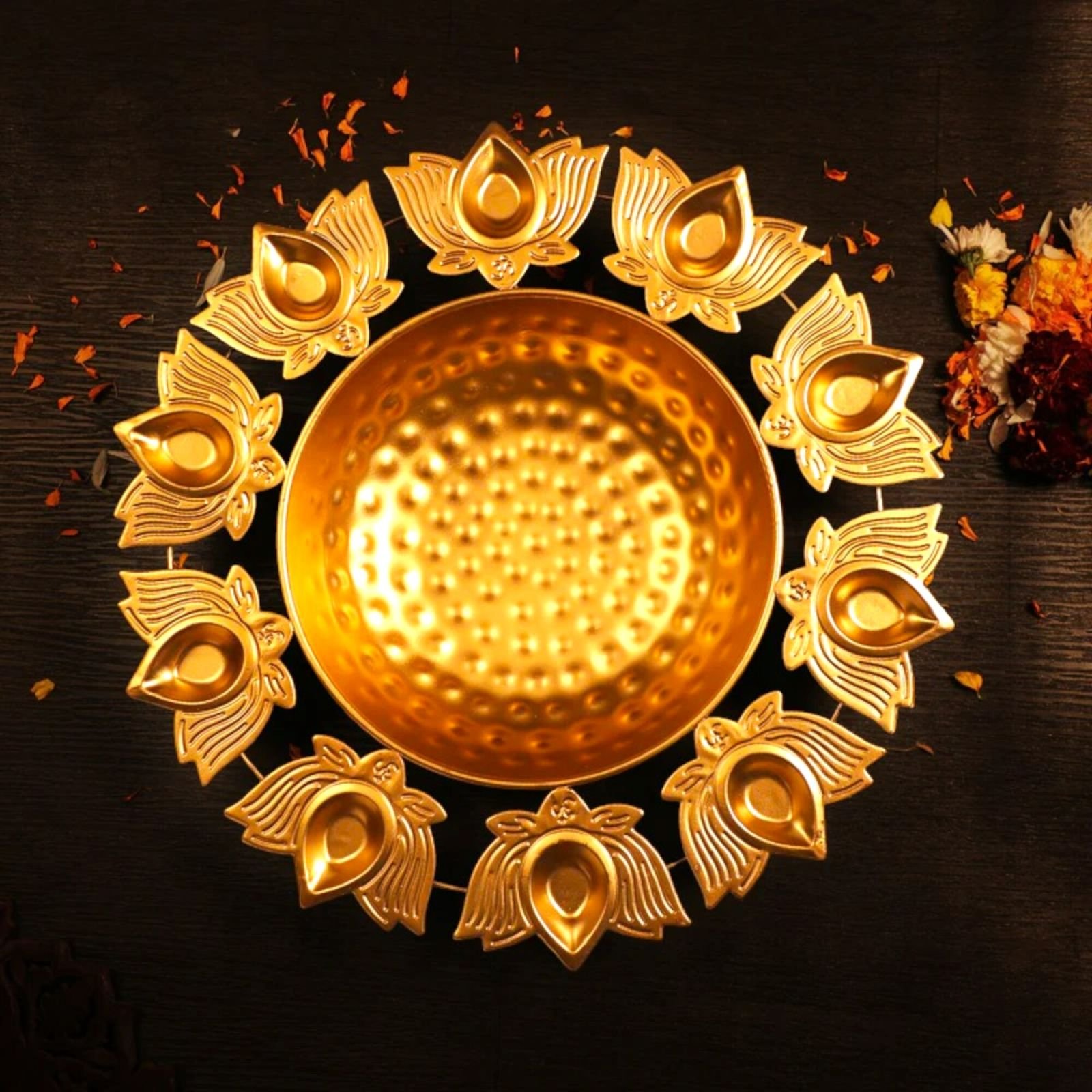 Gold-plated multipurpose diya stand set – compatible with tea light candles, oil lamps, and ghee lamps for versatile festival and decor use.